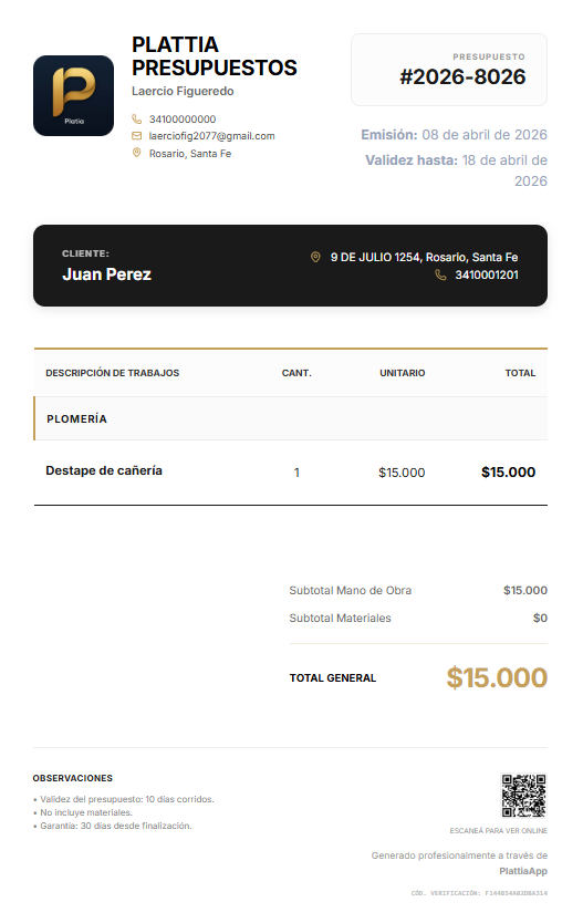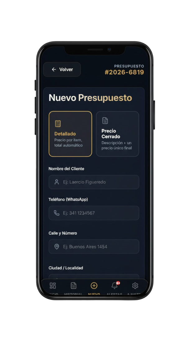 Escribí los detalles del trabajo y la IA los estructura en un presupuesto profesional listo para enviar